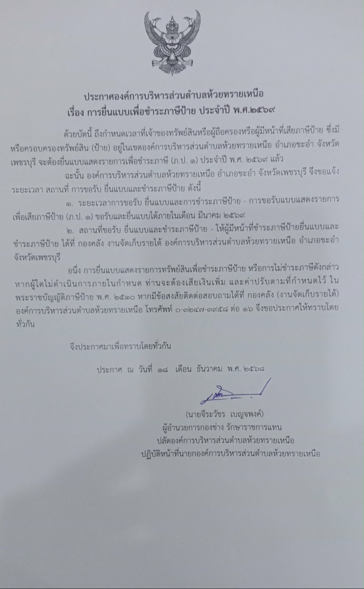 บัดนี้ ผู้รับจ้างได้แจ้งเข้าดำเนินการก่อสร้างตามโครงการดังกล่าวแล้วเมื่อวันที่ 17 ธันวาคม 2568 โดยจะเข้าดำเนินงานก่อสร้างตั้งแต่วันที่ 18 ธันวาคม 2568 เป็นต้นไป องค์การบริหารส่วนตำบลห้วยทรายเหนือ จึงขอประกาศประชาสัมพันธ์ให้ประชาชนได้ทราบโดยทั่วกัน