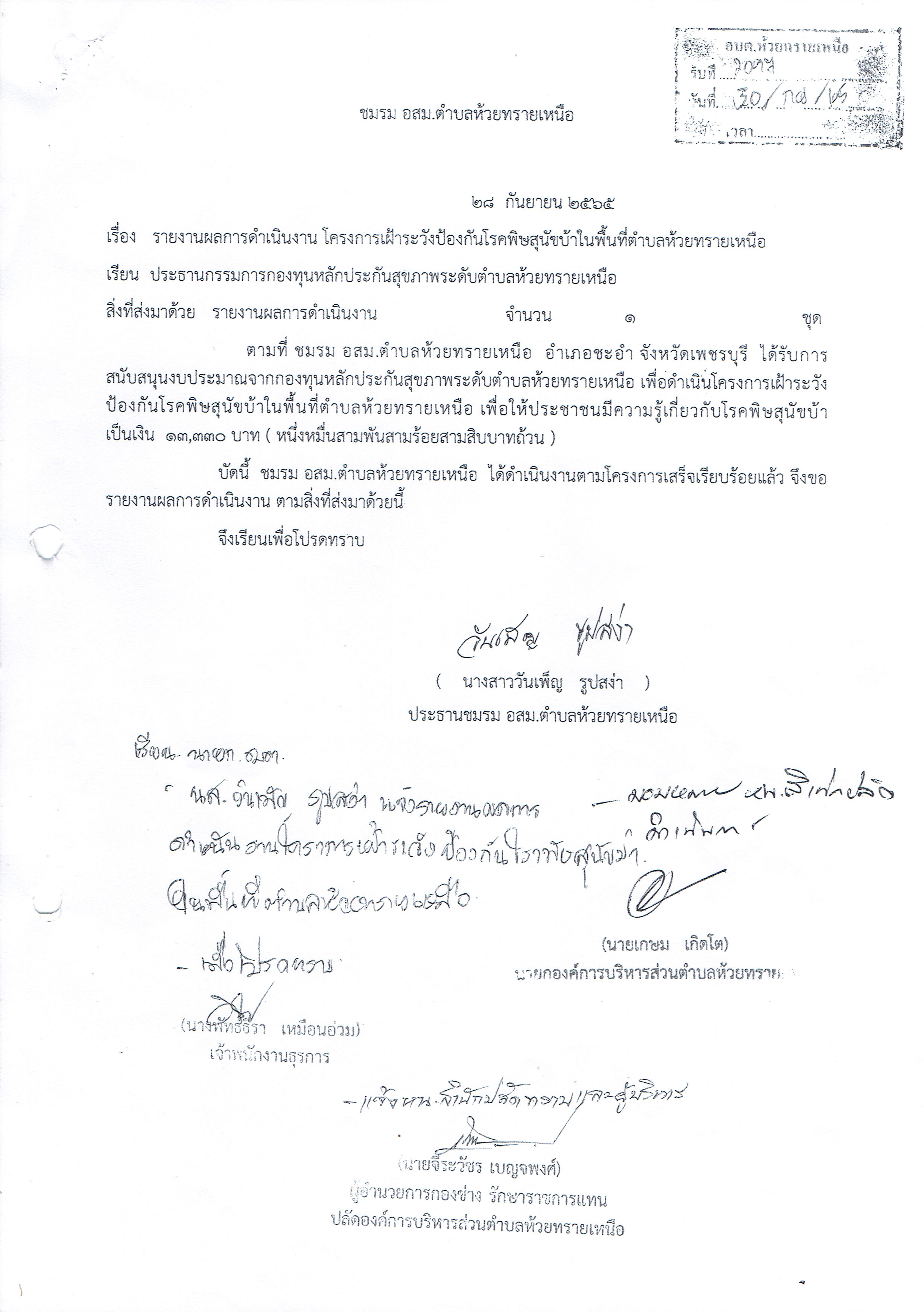 รายงานผลการดำเนินงานโครงการเฝ้าระวังป้องกันโรคพิษสุนัขบ้าในพื้นที่ตำบลห้วยทรายเหนือ